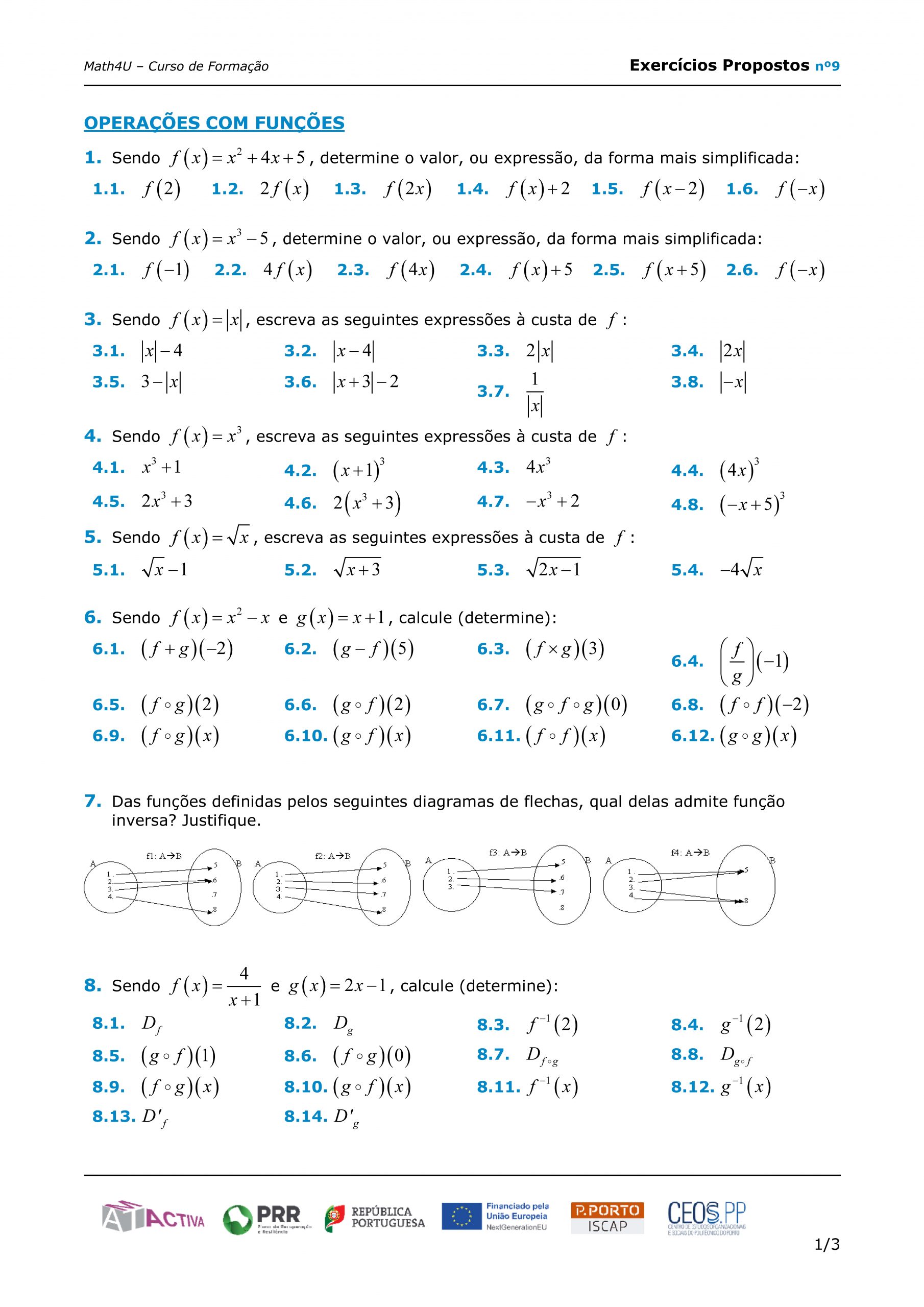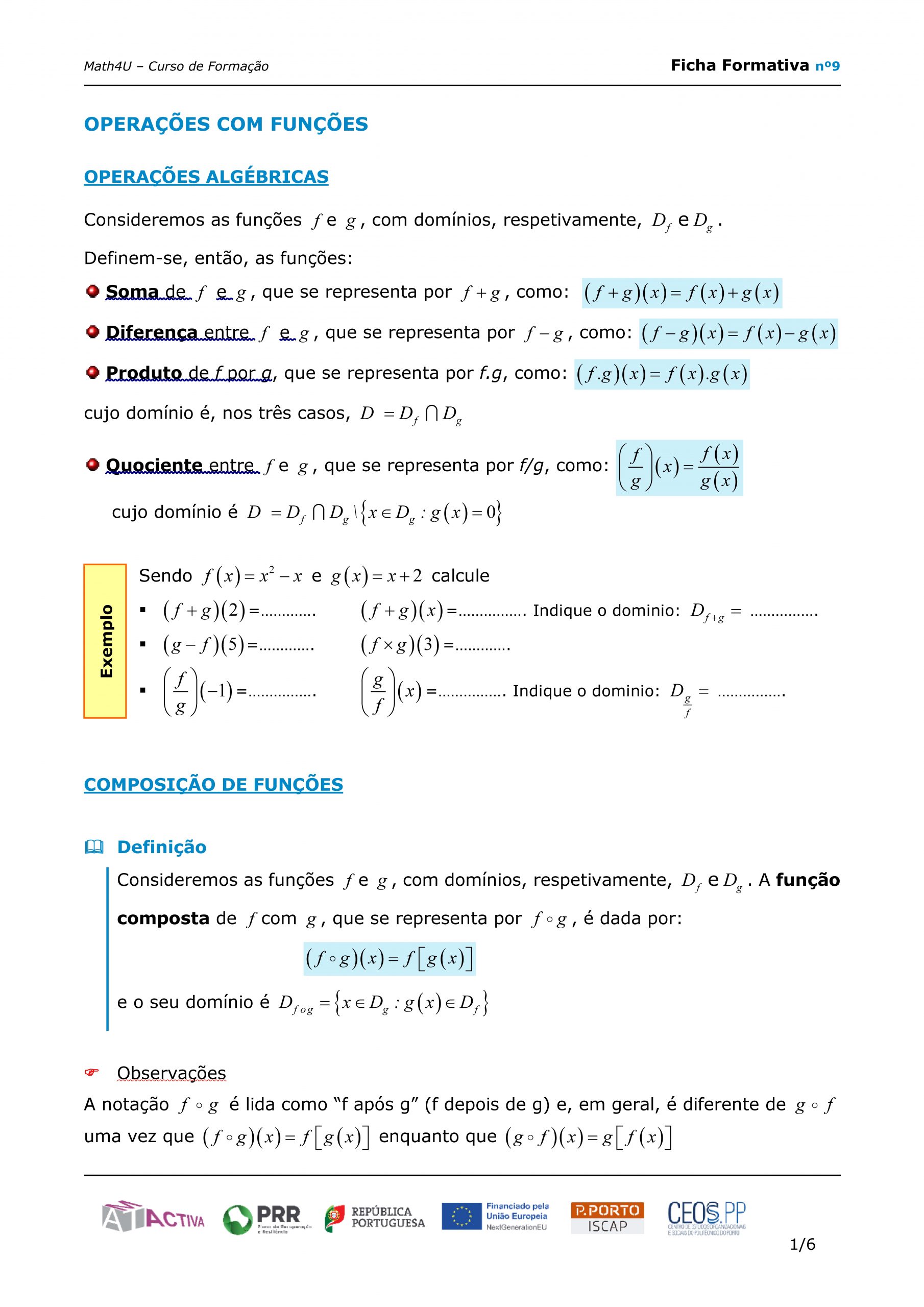 Ficha formativa – preparada para trabalho autónomo – sobre Operações com funções – Composta e Inversa, com enquadramento/resumo teórico, exemplos, e exercícios de aplicação.
