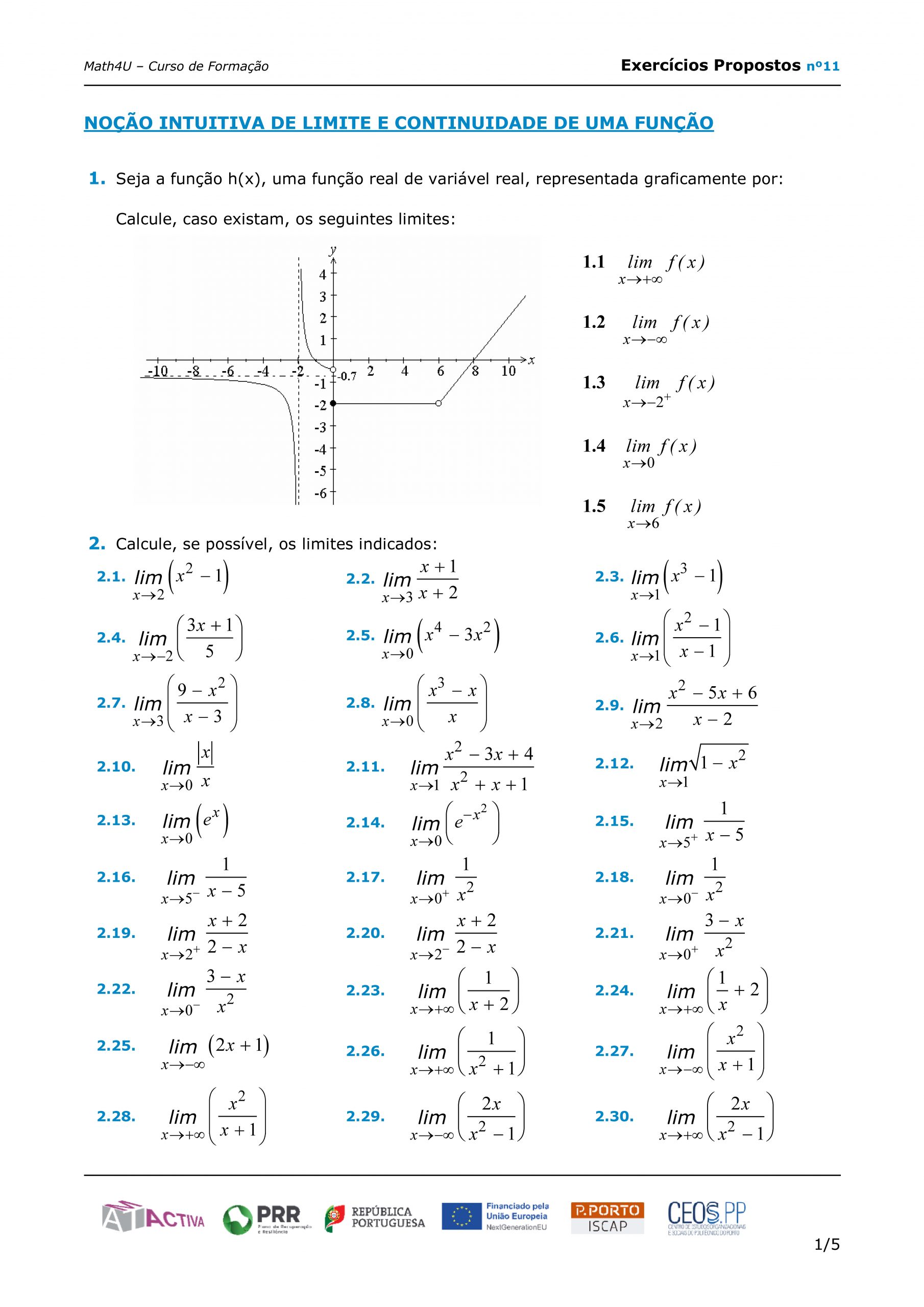 Noção de Limite de uma Função / Continuidade de Funções / Breve introdução a Assíntotas – exercícios