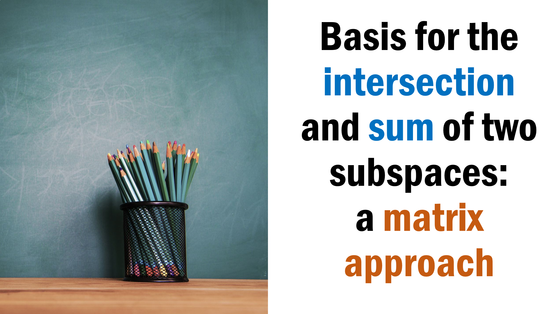 Matrix procedure that allows to obtain simultaneously both basis of the intersection and basis of the sum of two subspaces of a finite dimensional linear space; with examples and a quick test (editable pptx)