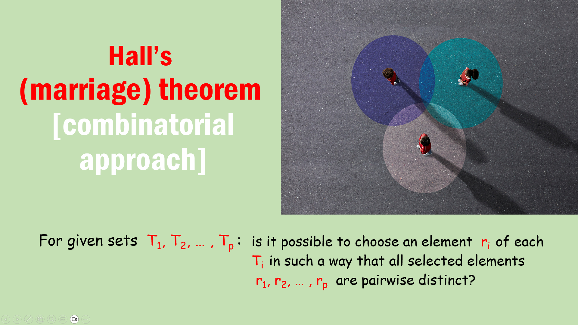 Explanation of Hall’s theorem using bipartite graphs; with examples and questions to be answered online (editable pptx)