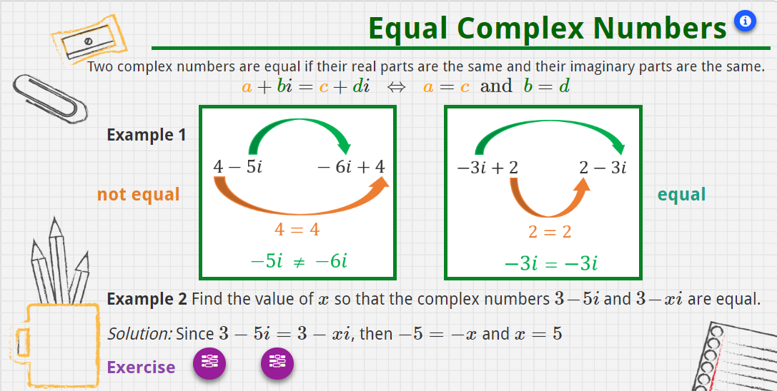 This OER explains the conditions under which two complex numbers are equal. It includes examples and interactive exercises to help students identify these conditions.