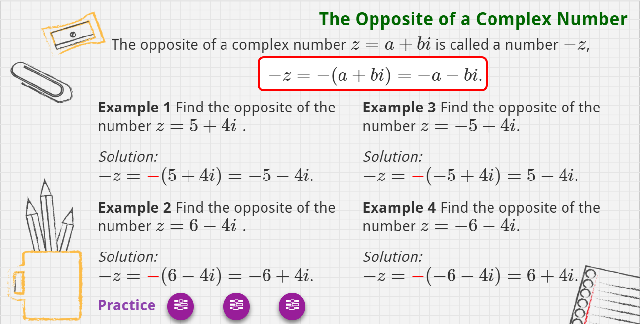 This OER introduces the concept of the opposite of complex numbers, explaining that the opposite of any complex number. It includes examples and interactive exercises for students to practice finding opposites of various complex numbers.