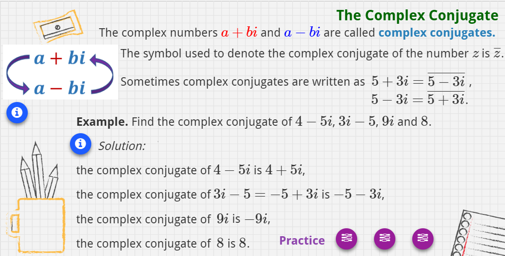 This resource provides a clear explanation of complex conjugates, supplemented with examples and interactive exercises to reinforce understanding. Designed to support self-paced learning, it guides students through essential concepts and helps them practice applications of complex conjugates effectively.