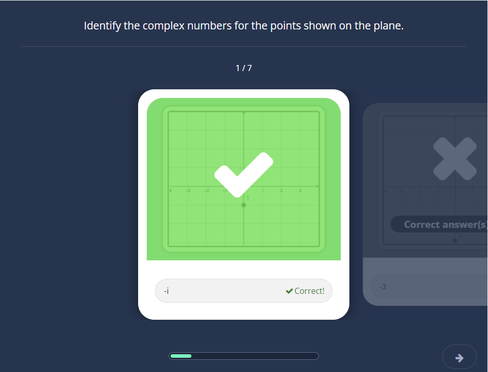 This set of flashcards presents complex numbers plotted on the real and imaginary axes, challenging students to identify and write each number in its algebraic form. By practicing this skill, learners enhance their understanding of complex number representation and coordinate-based interpretation.