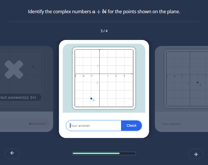 This flashcard set features complex numbers plotted off the axes on the complex plane, encouraging students to determine and write each point in its algebraic form. This exercise helps learners deepen their understanding of complex numbers in various positions, reinforcing skills in interpreting both real and imaginary components.