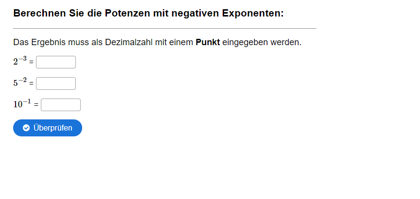 Aufgabe: Berechnen Sie die Potenzen mit negativen Exponenten.