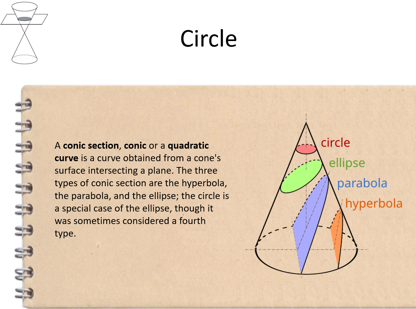 Definition of a circle as a conic section. Practical information to identify a circle and an example to practice (editable pptx).
