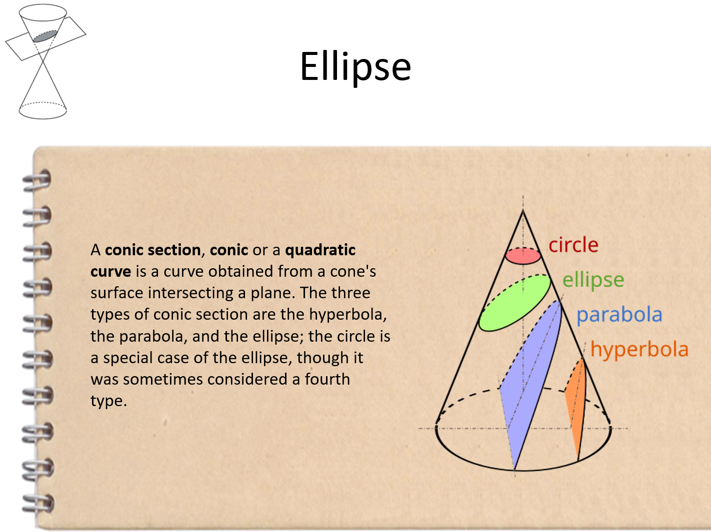 Definition of an ellipse as a conic section. Practical information to identify an ellipse and an example to practice (editable pptx).