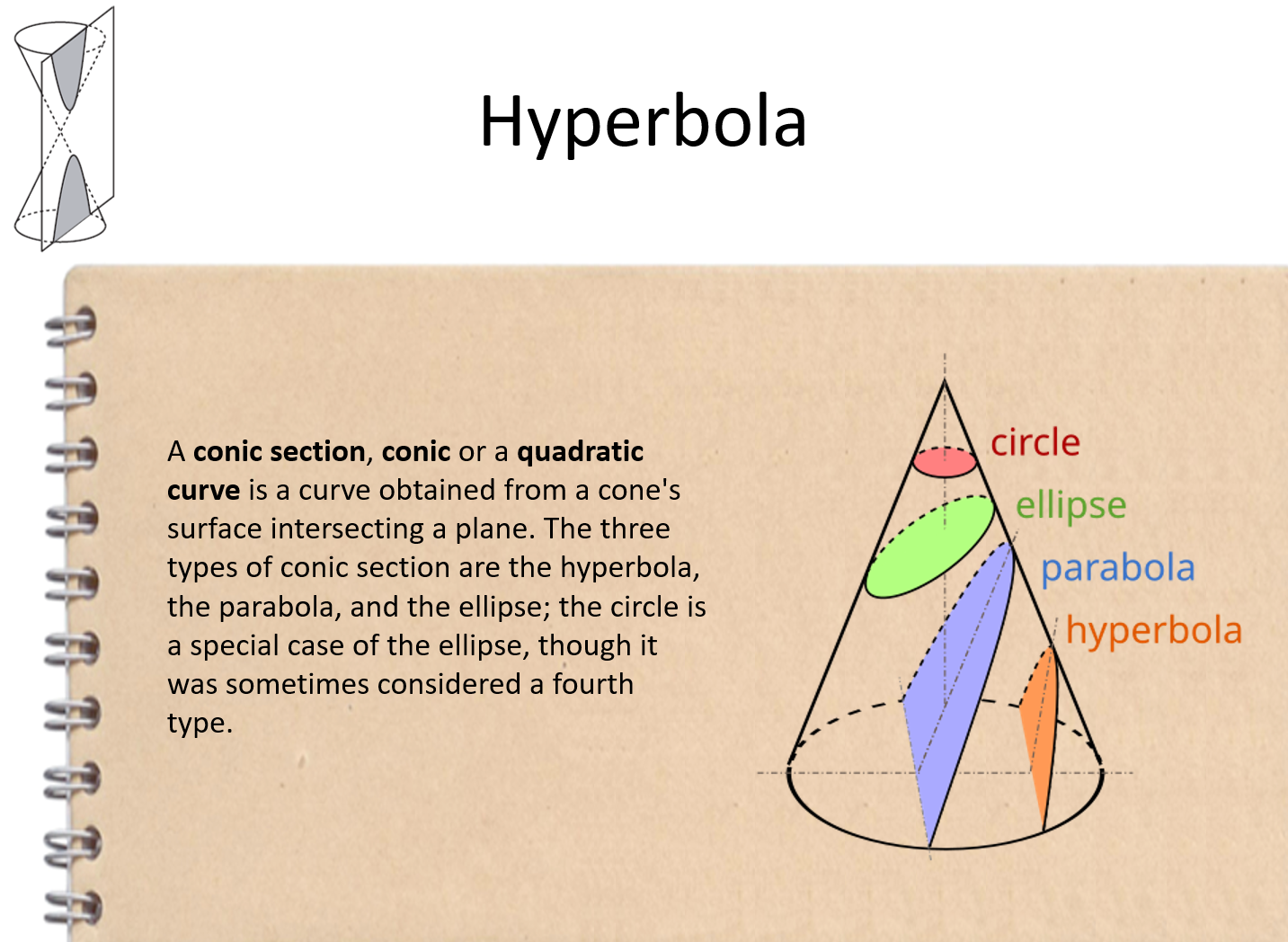 Definition of a hyperbola as a conic section. Practical information to identify a hyperbola and an example to practice (editable pptx).