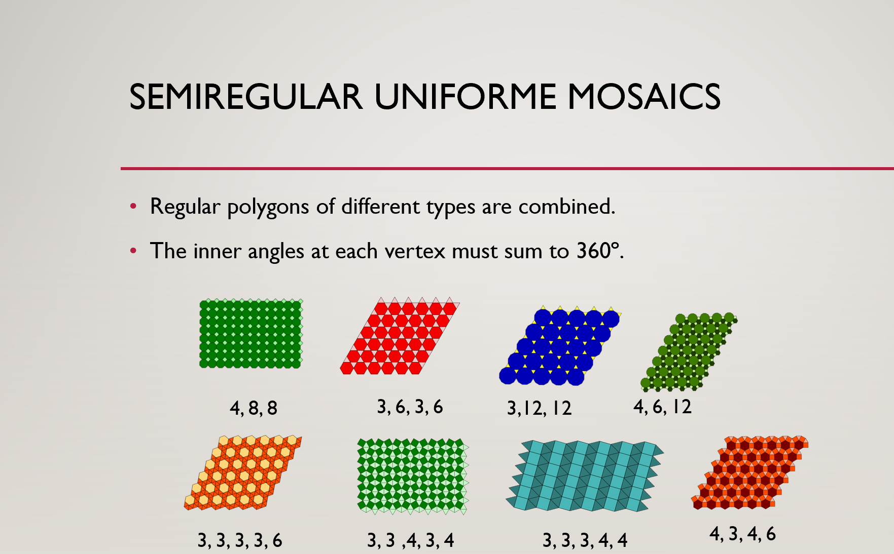 A mathematical presentation of mosaics. It describes the basic concepts of mosaics and their classes. It includes some techniques to design mosaics. A number of references and a link to an applet provide further information about the topic.