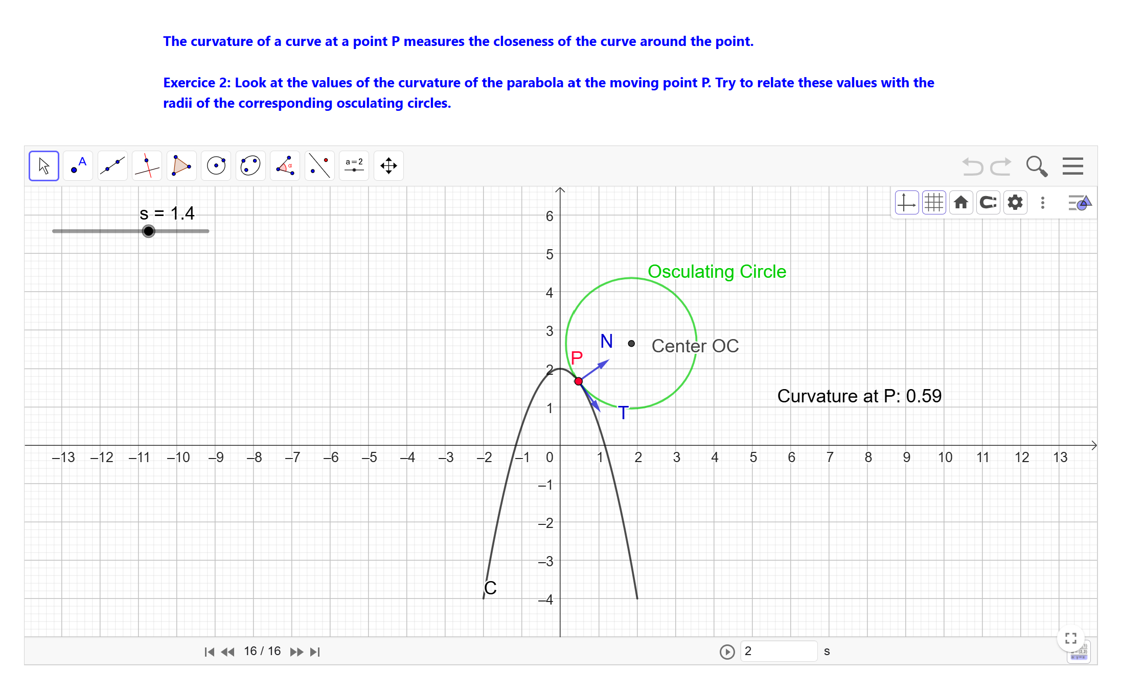 This activity is focused on a practical understanding of the curvature and the osculating circle of a plane curve. GeoGebra is required but the educational resource is available online at https://www.geogebra.org/m/vqxy6jrd