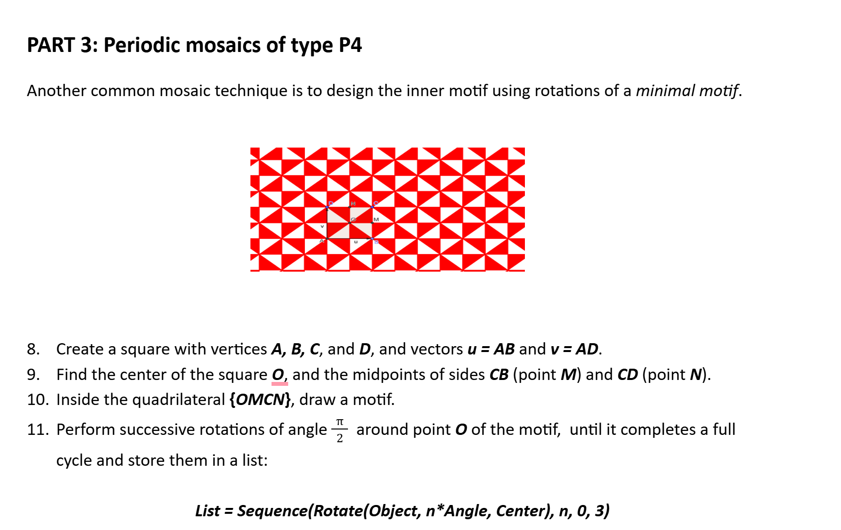 This exercice sheet allows the experimentation with the basic planar affine maps (translation, rotation, symmetries) by elaborating several types of mosaics. GeoGebra is required.