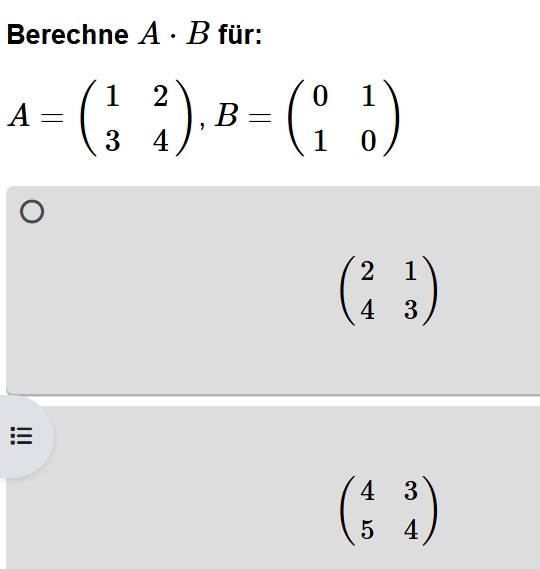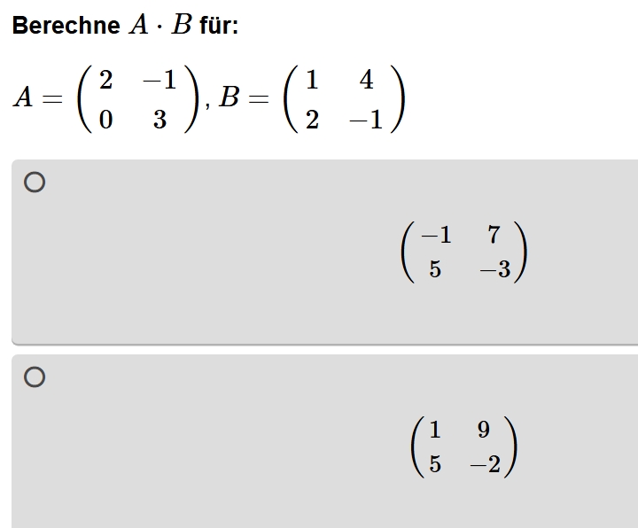Multiplikation zweier kompatibler Matrizen. Hinweis: Erfordert die Verwendung eines speziellen Plug-ins/Software.