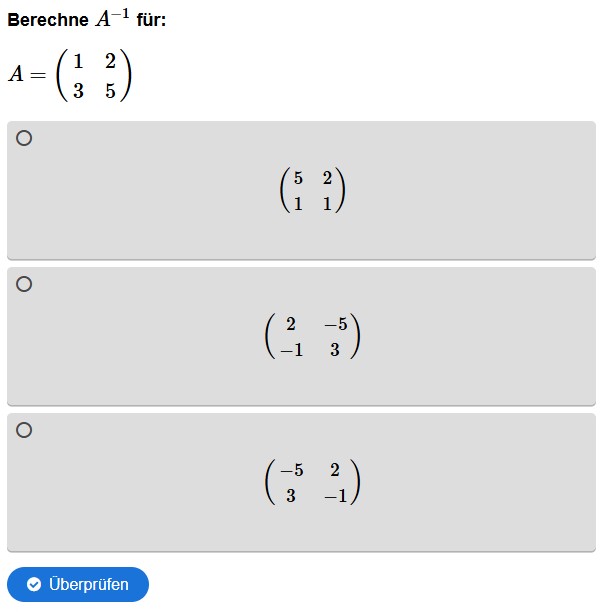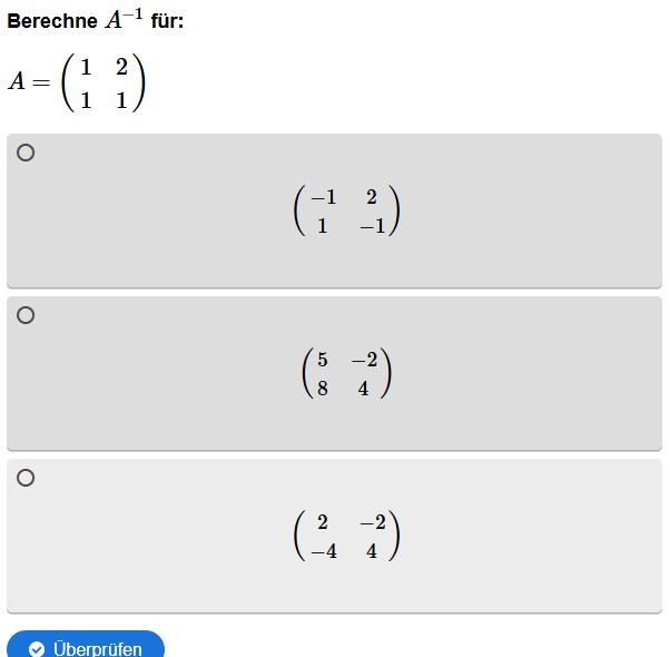Berechnung der Inversen einer 2×2-Matrix. Hinweis: Erfordert die Verwendung eines speziellen Plug-ins/Software.