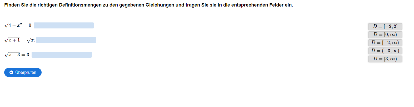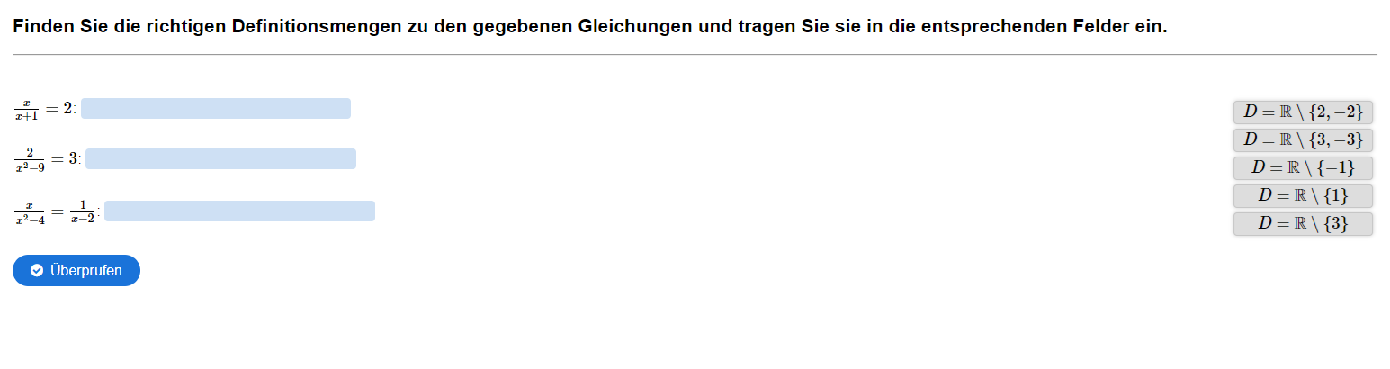 Aufgabe: Finden Sie die richtigen Definitionsmengen für die gegebenen Gleichungen
