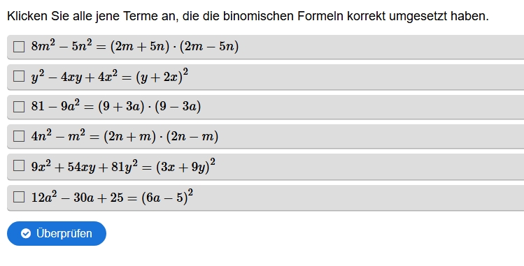 Aufgabenstellung: Aus mehreren Gleichungen zu binomischen Formeln sollen die korrekten gefunden werden.