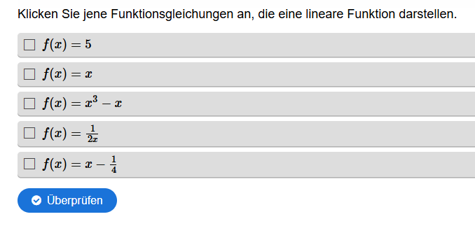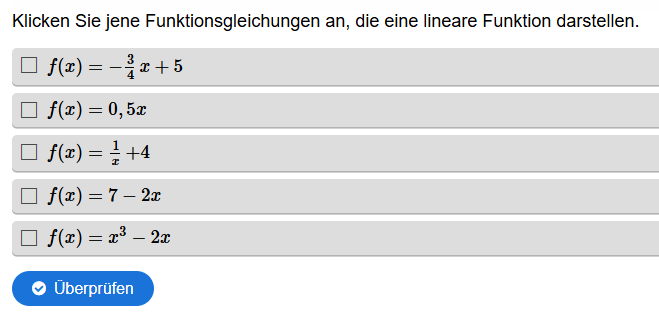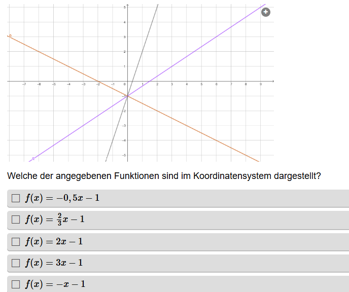 Aufgabe: Gegeben ist ein Diagramm mit mehreren linearen Funktionen. Es sollen alle jene Funktionsgleichungen angeklickt werden, die im Diagramm dargestellt sind.