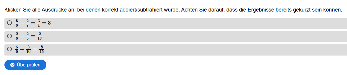 Aufgabenstellung: Es sind Additionen von Brüchen mit Ergebnissen vorgegeben, es sollen die richtigen gefunden werden.
