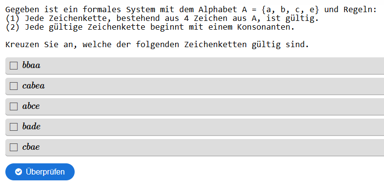 Aufgabenstellung: Für ein vorgegebenes Formalsystem müssen korrekten Zeichenketten gefunden werden.