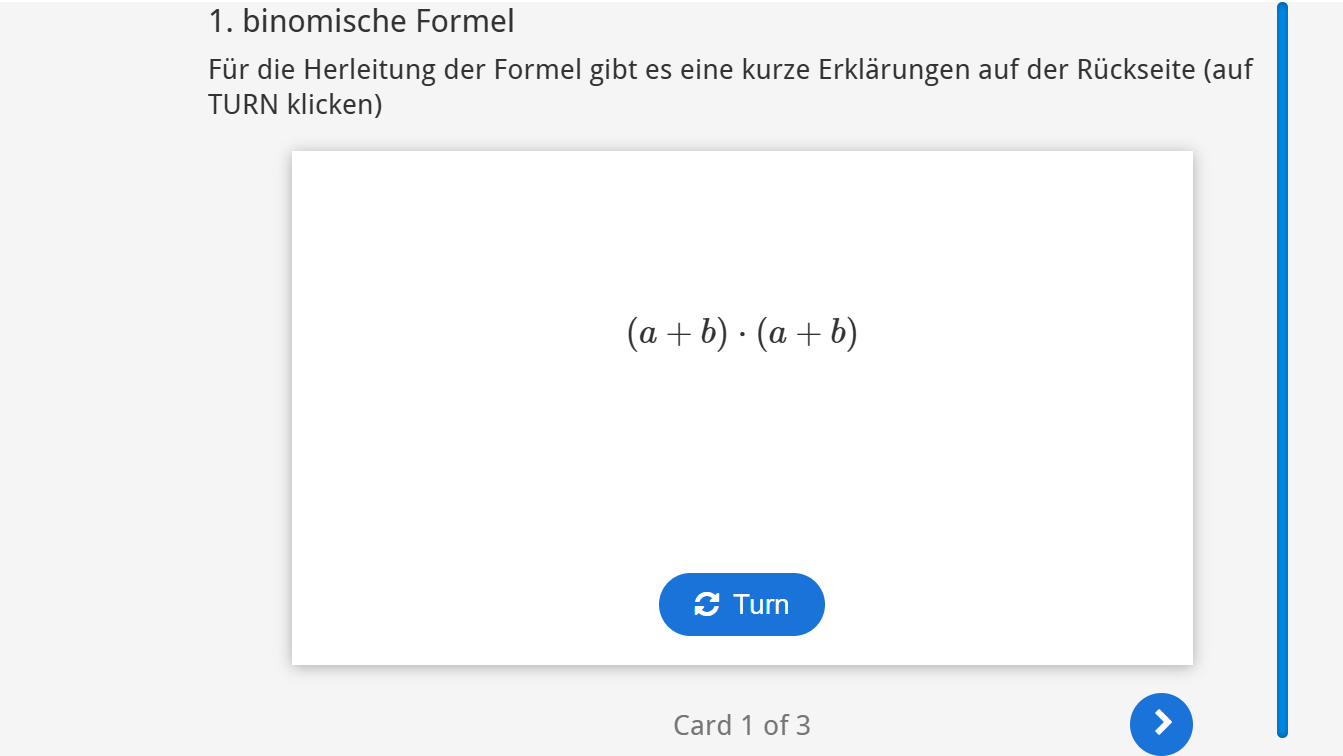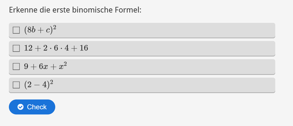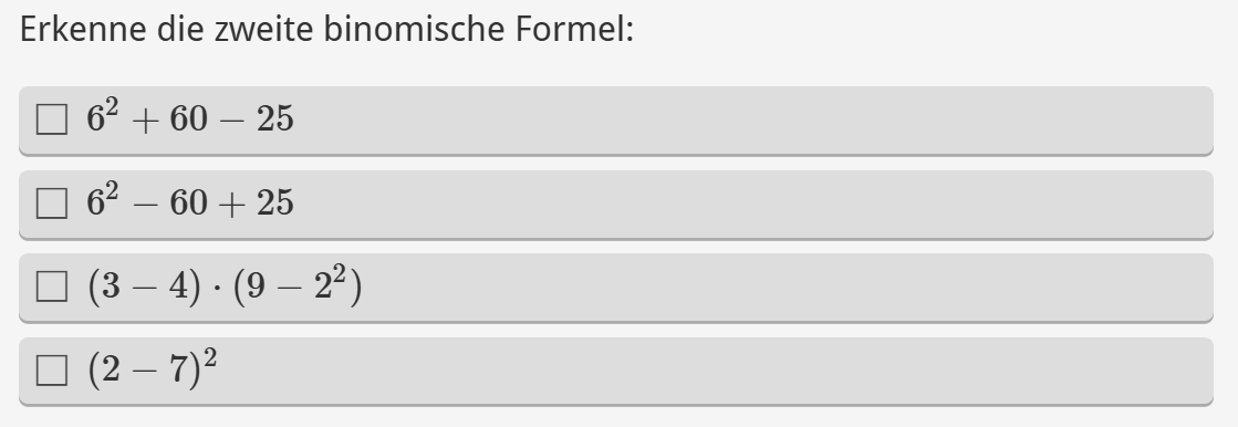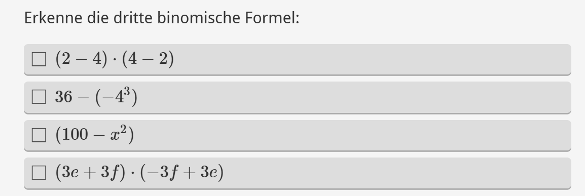 Aufgabenstellung: aus mehreren Ausdrücken sollen jene Terme angeklickt werden, die der 3. binomischen Formel entsprechen