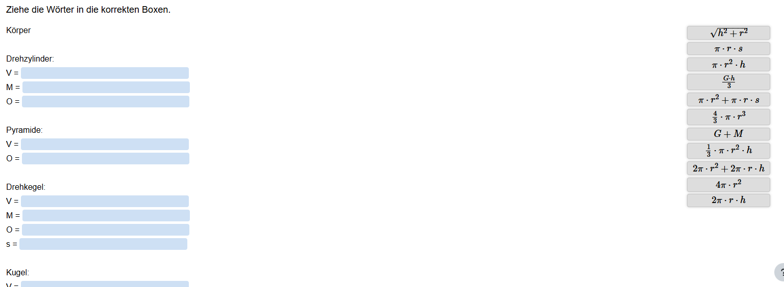 Aufgabenstellung: Zu den entsprechenden Körpern sollen die entsprechenden Formel für Oberfläche, Volumen und Mantel gefunden werden