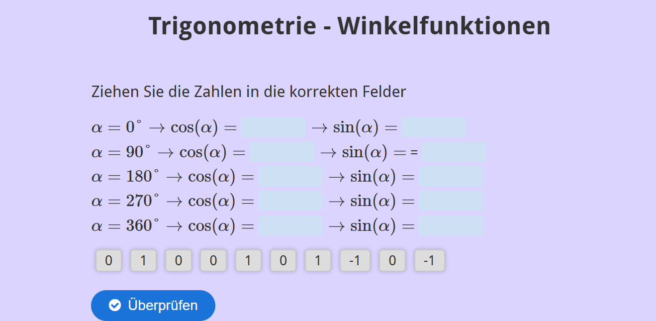 Aufgabenstellung: Die entsprechende Werte für Kosinus und Sinus sollen für gegebene Winkel ausgewählt werden.