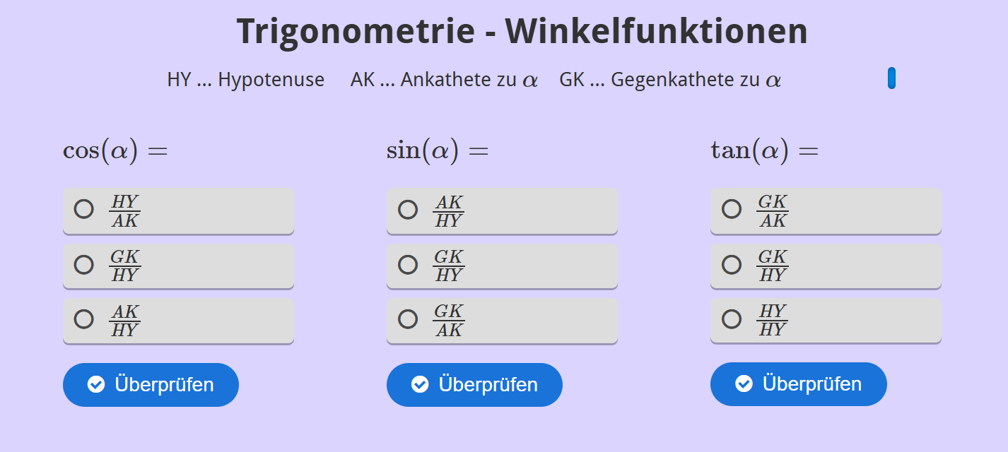 Aufgabenstellung: Zu den Winkelfunktionen sollen die entsprechenden Formeln angeklickt werden.