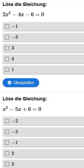Aufgabenstellung: Gegeben sind quadratische Gleichungen, zu denen die richtige Lösungen gefunden werden sollen.