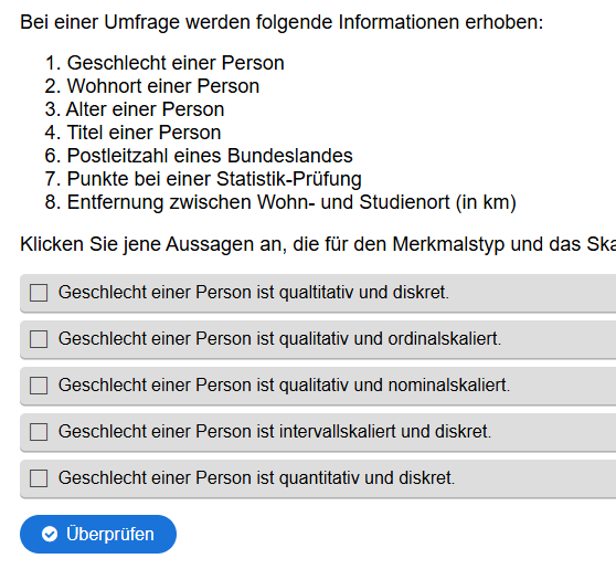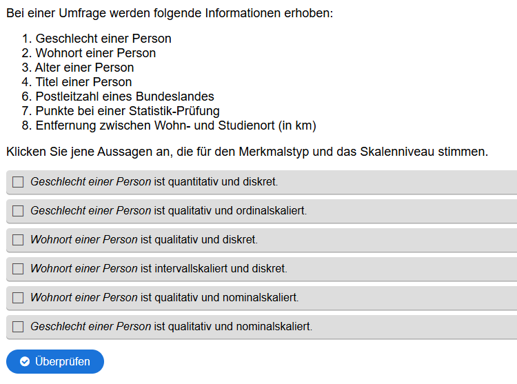 Aufgabenstellung: Zu Merkmalen sollen die korrekten Aussagen zu Merkmalstyp und Skalenniveau gefunden werden.