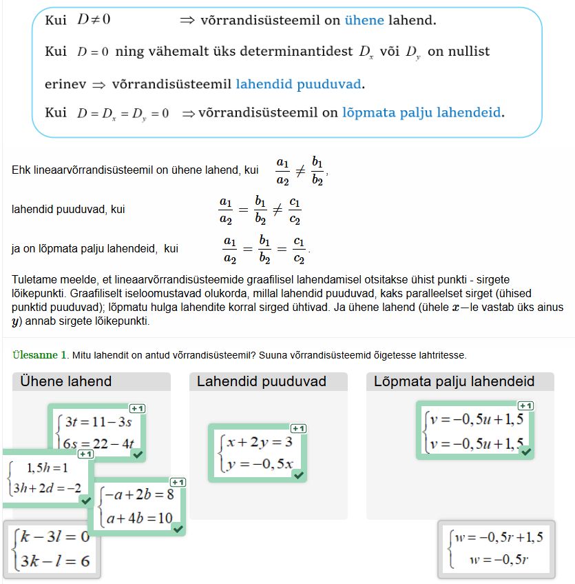 interaktiivsed ülesanded kahe tundmatuga lineaarvõrrandite süsteemide lahendamise Crameri valemite abil kohta