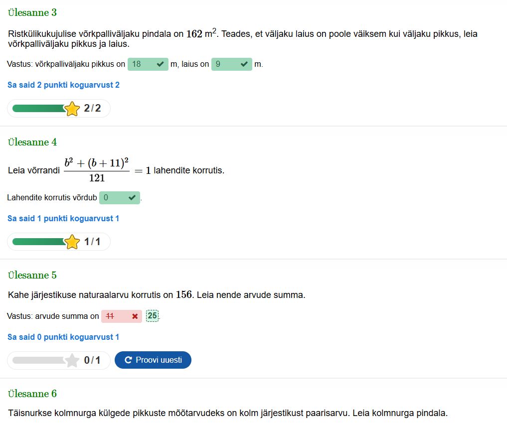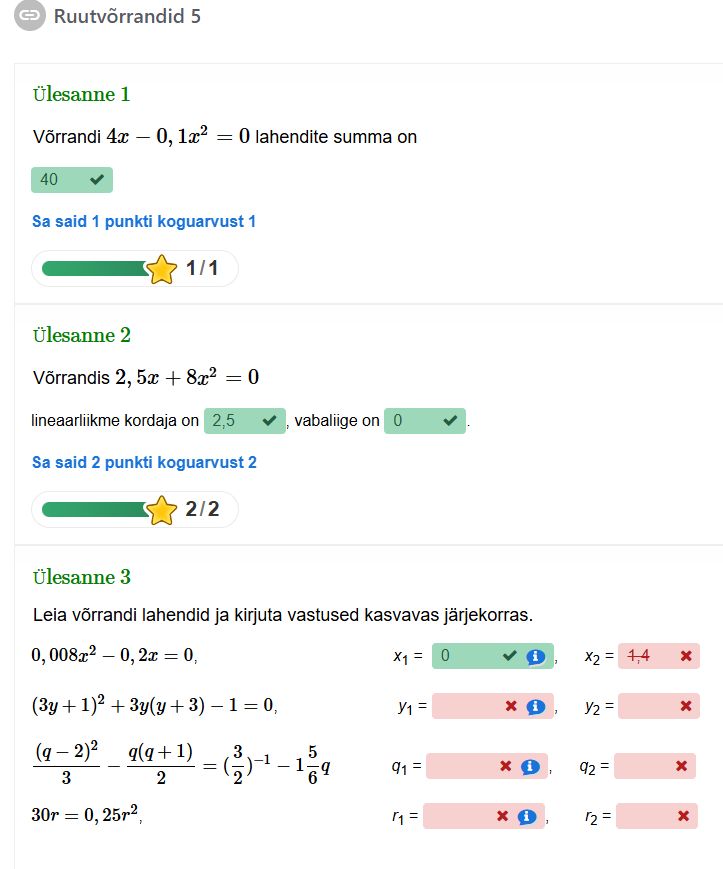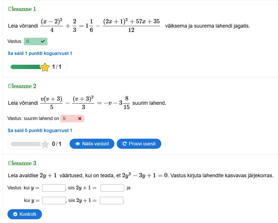 Mitmesugused interaktiivsed ülesanded, ka tekstiülesanded, mis on seotud ruutvõrranditega