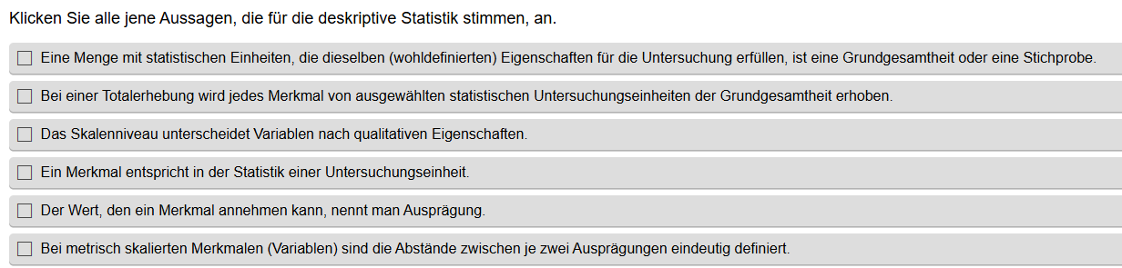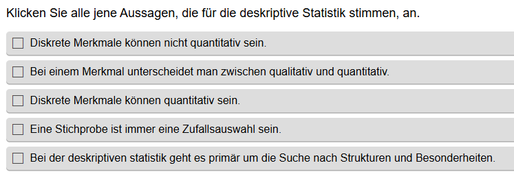 Aufgabenstellung: Aus mehreren Aussagen zur deskriptiven Statistik müssen die korrekten Aussagen gefunden werden.