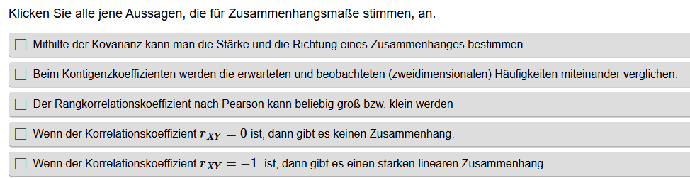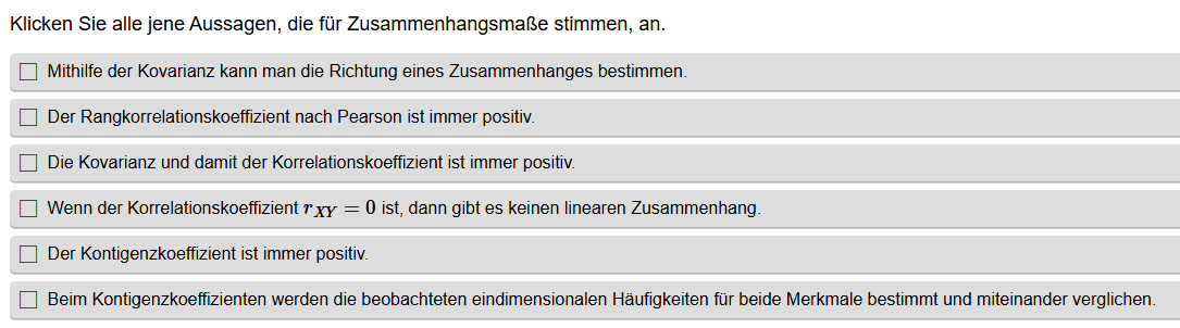 Aufgabenstellung: Aus mehreren Aussagen zu Zusammenhangsmaßen müssen die korrekten Aussagen gefunden werden.