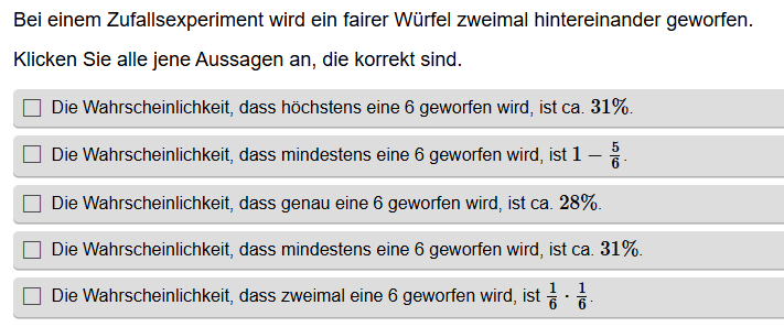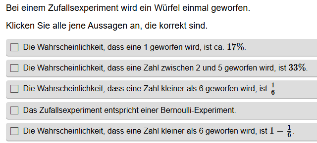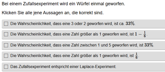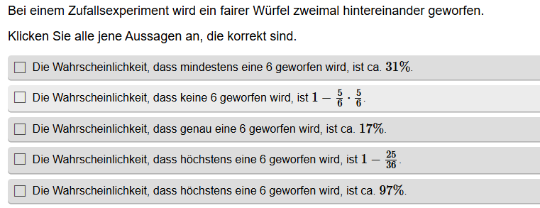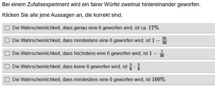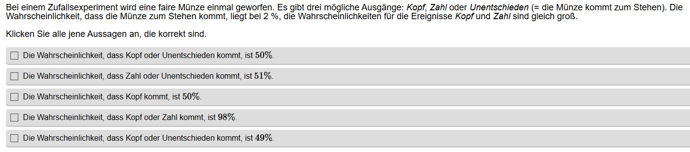 Aufgabenstellung: Aus mehreren Aussagen zu Wahrscheinlichkeiten müssen die korrekten Aussagen gefunden werden.