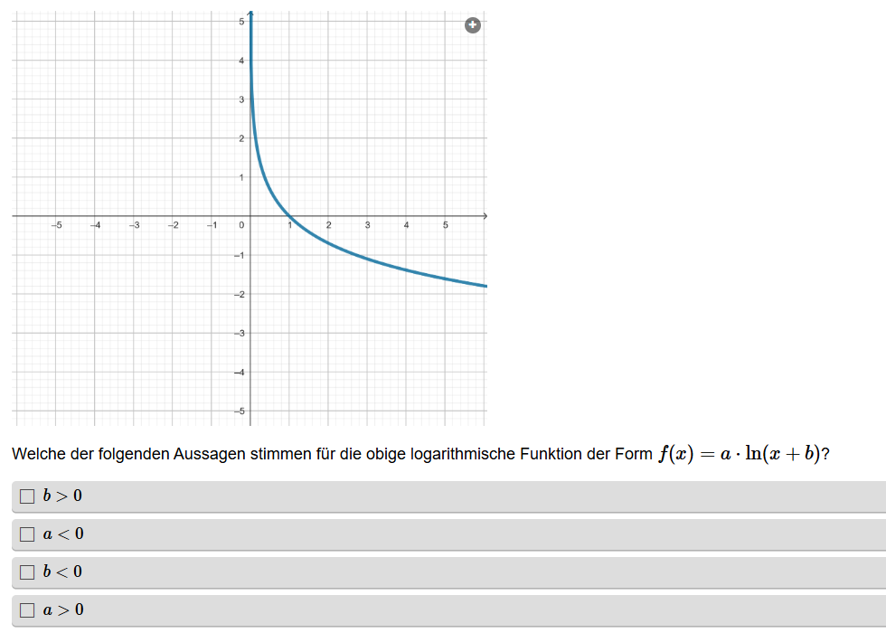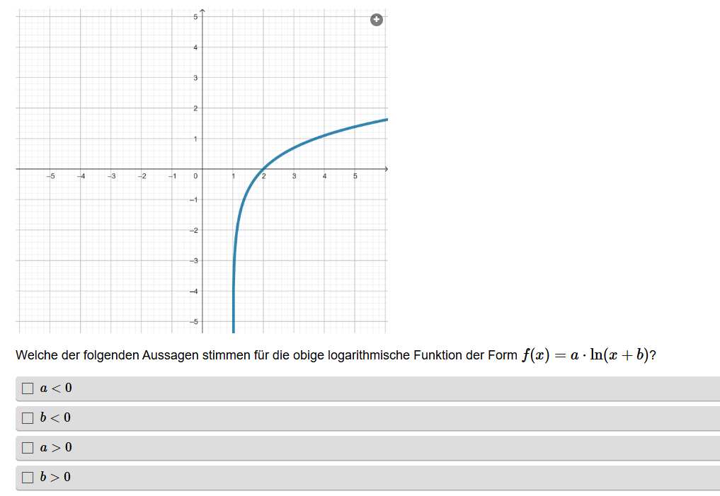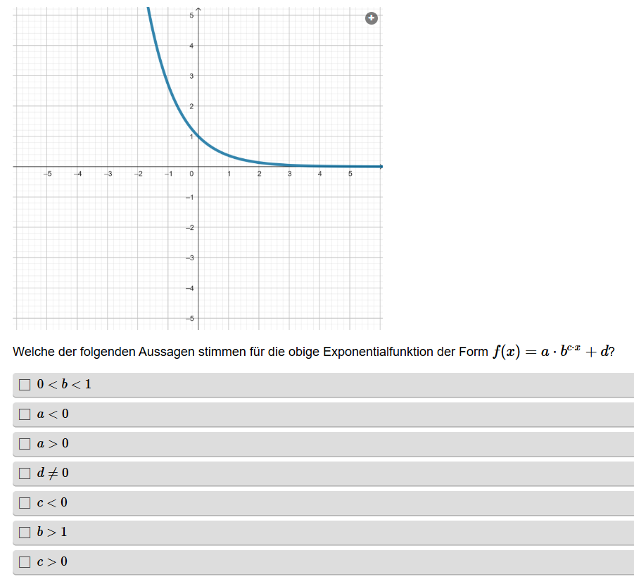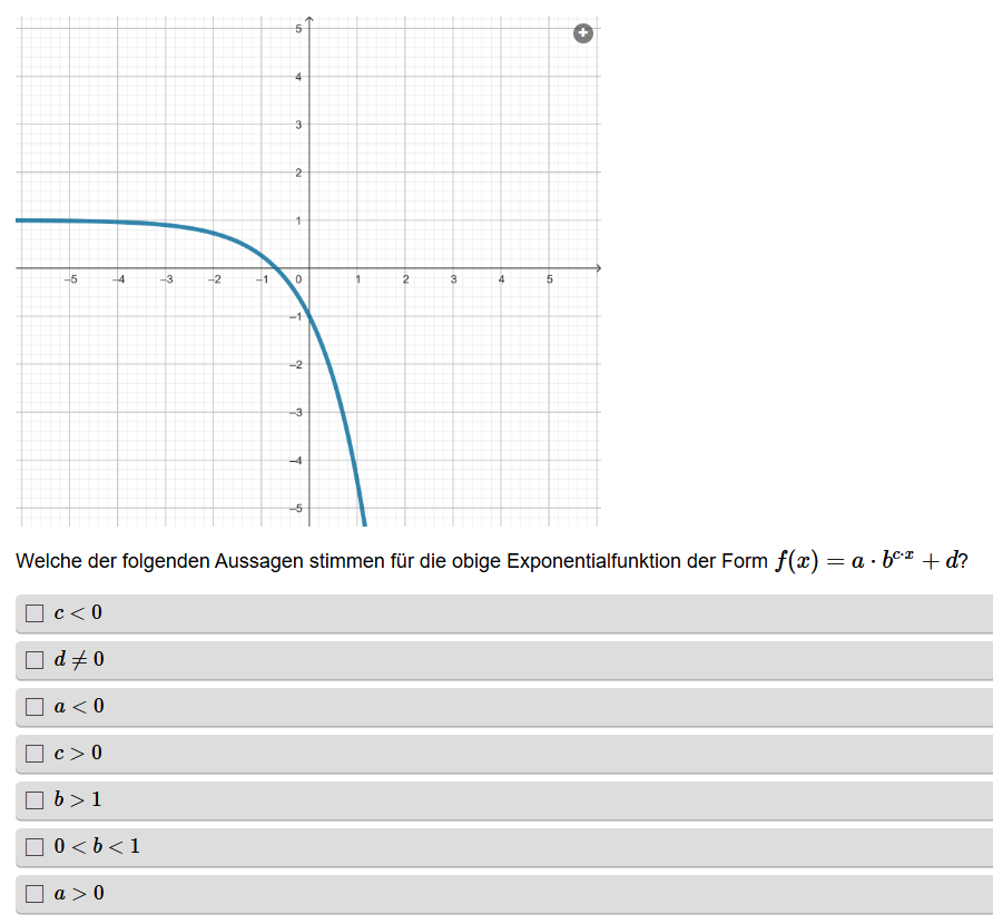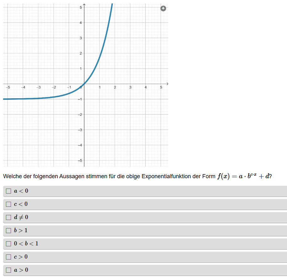 Aufgabenstellung: Zu einem Graphen einer Funktion müssen die richtigen Aussagen in Hinblick auf die Parameter gefunden werden.
