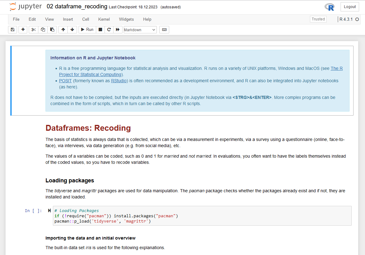 Anmerkung: Das Material kann auf zwei Arten genutzt werden: lokal, indem R und Jupyter Notebook am Computer installiert werden, oder online, indem die Ressource downgeladen und auf Google Colab (oder kaggle) hochgeladen wird.