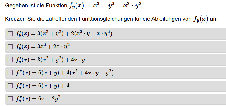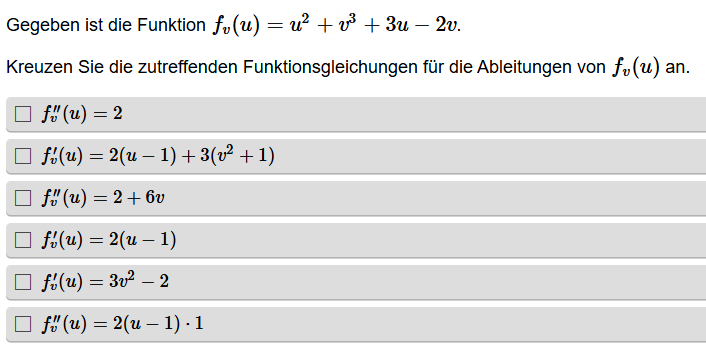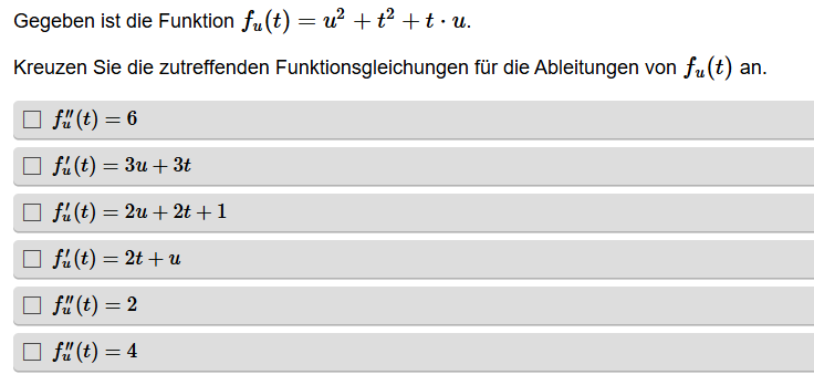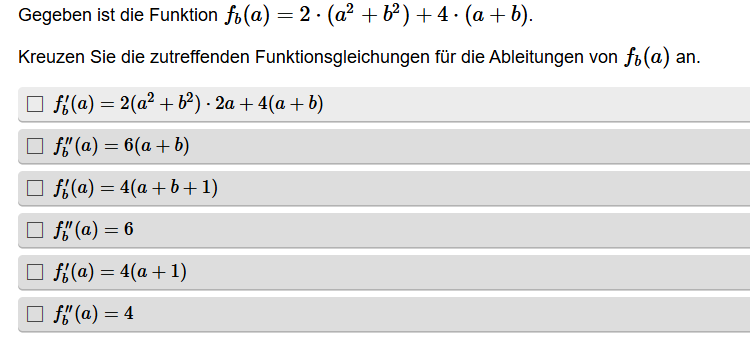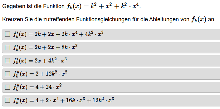 Aufgabenstellung: Zu einer Funktionsgleichung mit Parameter sollen richtige Ableitungen erkannt werden.