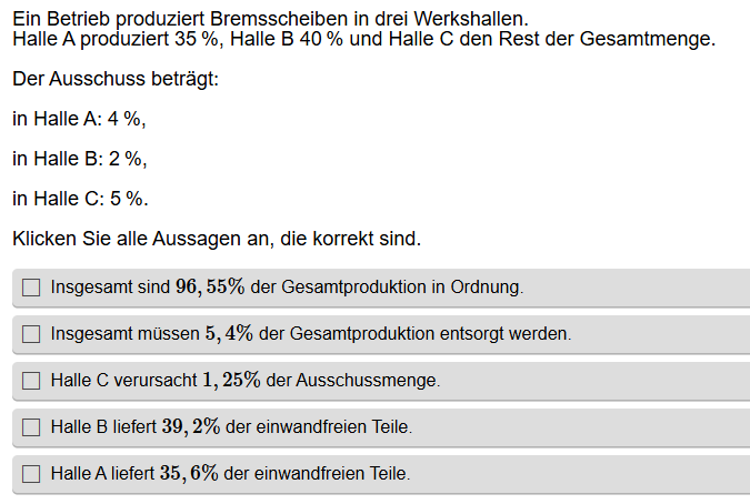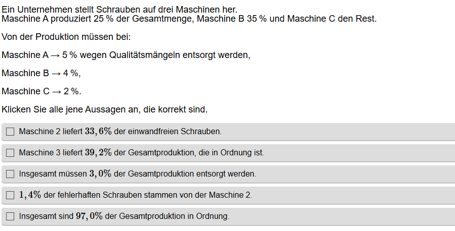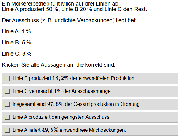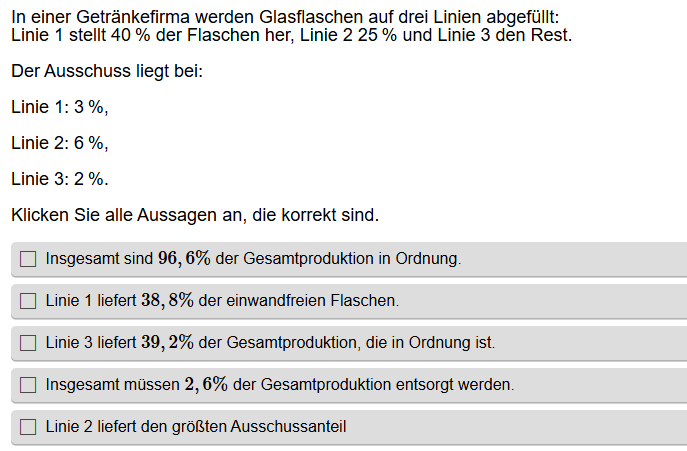 Aufgabenstellung: Aus mehreren Aussagen zu Wahrscheinlichkeiten müssen die korrekten Aussagen gefunden werden.