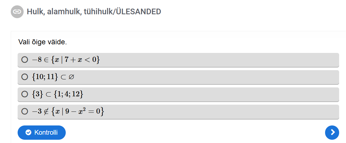 Harjutusülesanded hulkade, alamhulkade ja tühihulga teemal. Õpilane peab määrama, millised väited hulga kuuluvuse ja alamhulkade kohta on õiged või väärad.