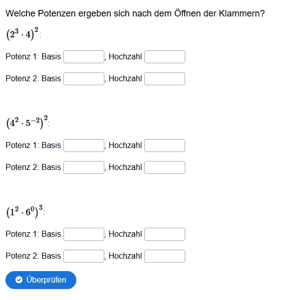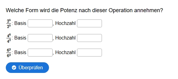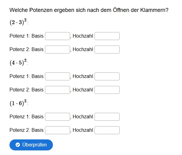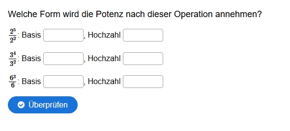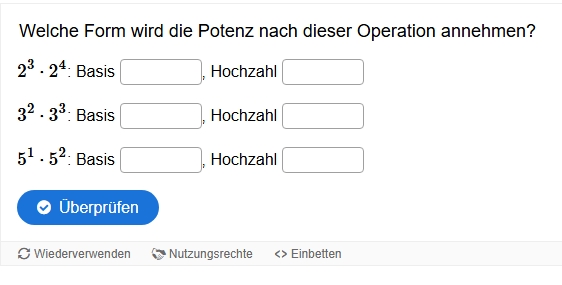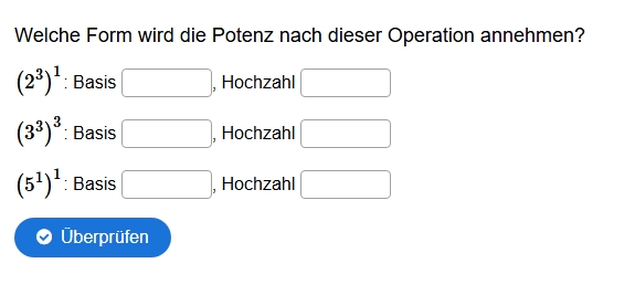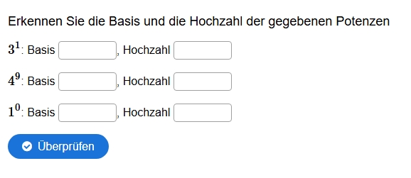Aufgabenstellung: Eingabe der Antwort in das entsprechende Feld (Basis und Hochzahl finden)
