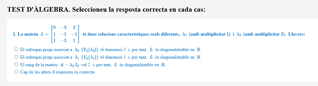 Test de cinc preguntes (amb una sola resposta correcta cadascuna) sobre qüestions relatives a valors i vectors propis i diagonalitzabilitat d’una matriu quadrada.