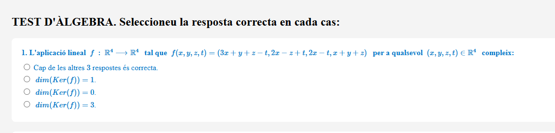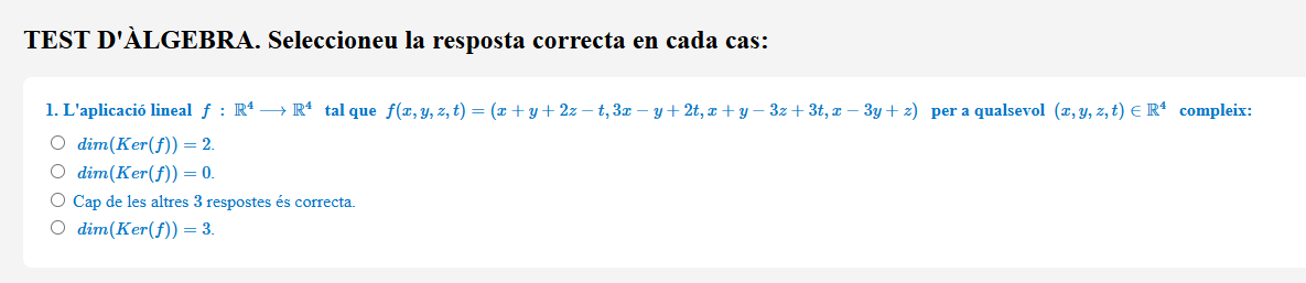 Test de cinc preguntes (amb una sola resposta correcta cadascuna) sobre qüestions relatives a producte de matrius i aplicacions lineals.
