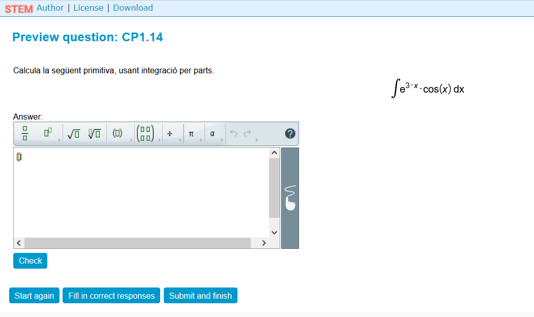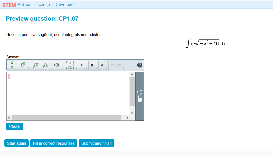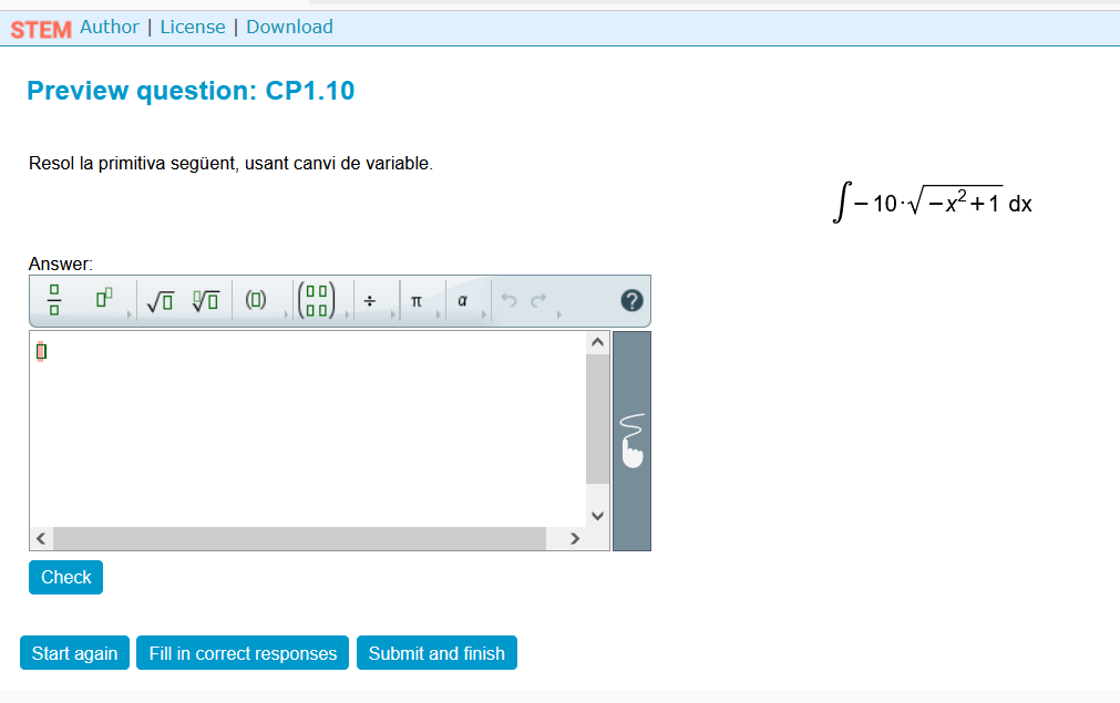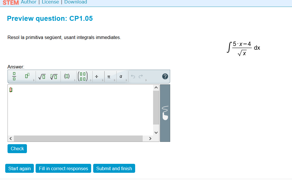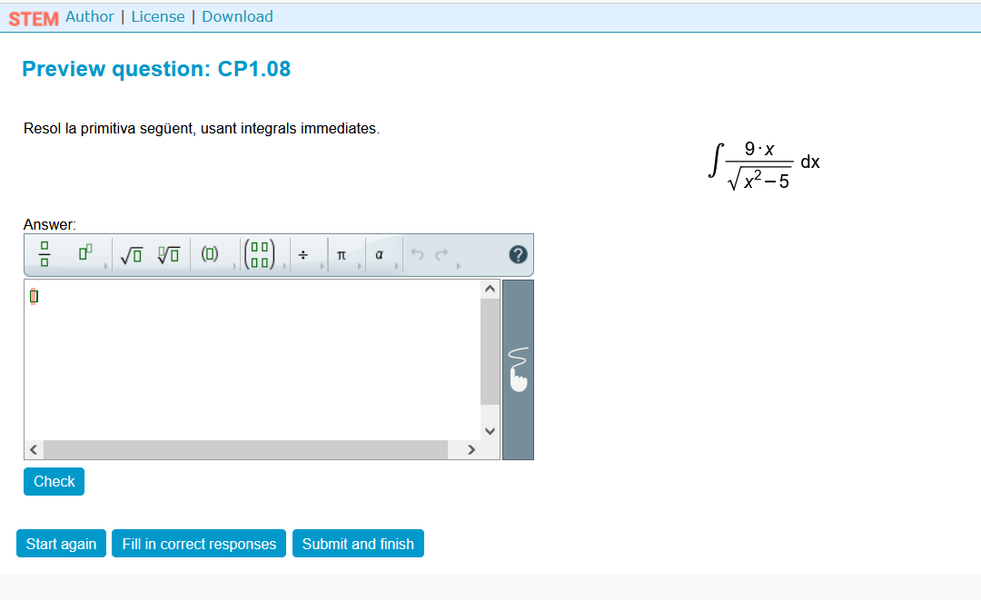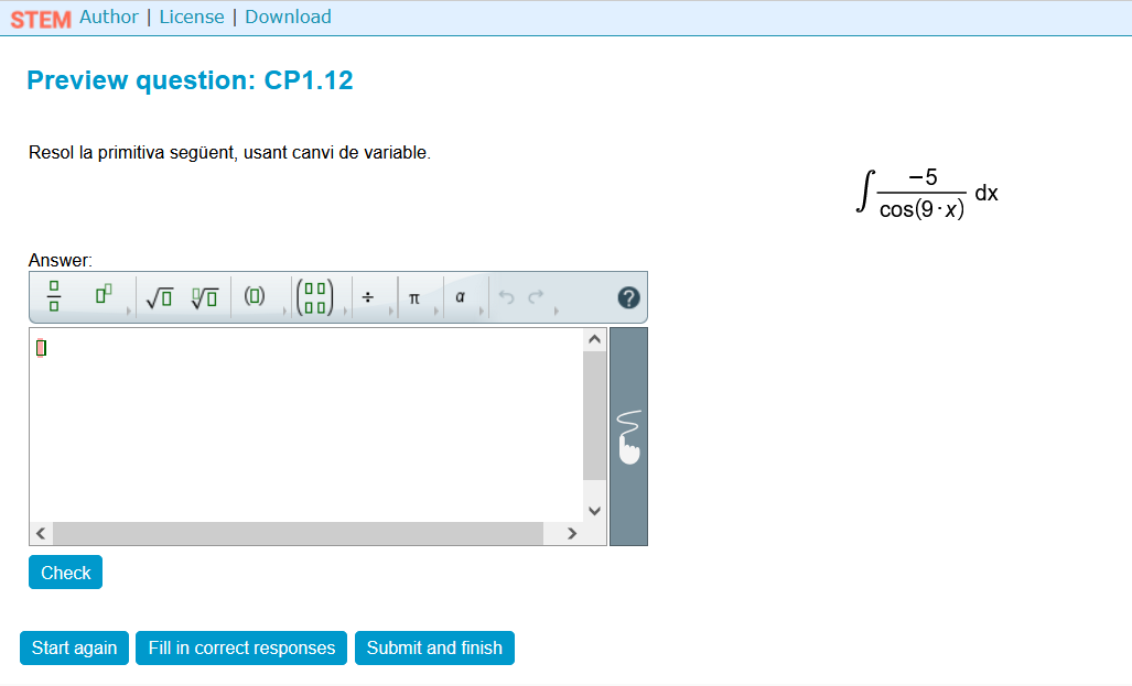 Qüestió interactiva per a incloure a un curs de Moodle. Exemple de càlcul de primitives. Aquesta pregunta forma part de Stem Collection (https://stemcollection.com/om/24/ca) i utilitza WIRIS quizzes, així que es necesita WIRIS (https://www.wiris.com/es/). Pots comprovar la teva resposta, omplir les respostes correctes i començar de nou amb un altre exemple similar. També pots obtenir l’algoritme de creació de la pregunta i descarregar-lo per a obtenir el teu HTML de la pregunta.