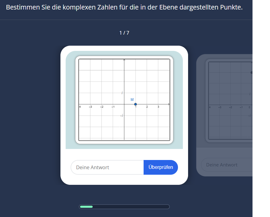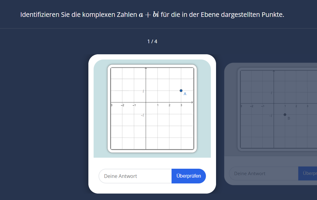 Dieses Lernkartenset zeigt komplexe Zahlen, die auf den Achsen der komplexen Ebene aufgetragen sind, und ermutigt die Studierenden, jeden Punkt in seiner algebraischen Form zu bestimmen und zu schreiben. Diese Übung hilft den Lernenden, ihr Verständnis für komplexe Zahlen in verschiedenen Positionen zu vertiefen und stärkt die Fähigkeiten, sowohl reale als auch imaginäre Komponenten zu interpretieren.