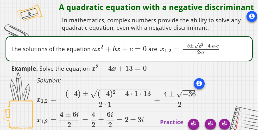 This OER explains how to solve quadratic equations with a negative discriminant, leading to complex solutions. It includes interactive exercises such as identifying the nature of roots, solving quadratic equations step by step using the quadratic formula, and plotting complex solutions on a coordinate plane. These activities help students understand the concept and apply it to real-world contexts like electrical engineering and physics.