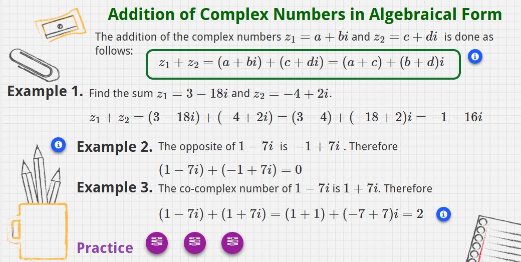 This OER covers the addition of complex numbers in algebraic form, showing how real and imaginary parts are combined separately. Interactive exercises guide students through step-by-step calculations and visual representations on the complex plane. The resource helps learners develop a strong foundation in complex number operations for further mathematical applications.