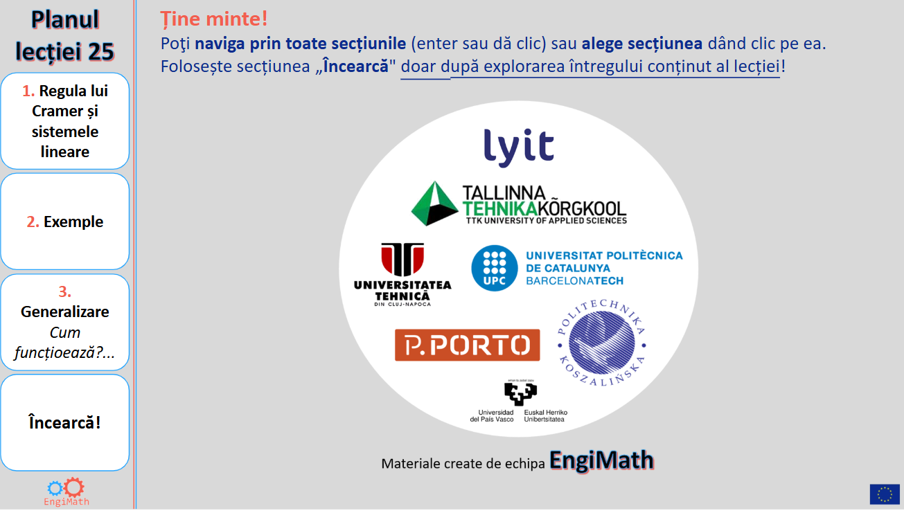 În această lecție 25 se va analiza cum se aplică regula lui Cramer pentru rezolvarea ecuațiilor liniare simultane.
