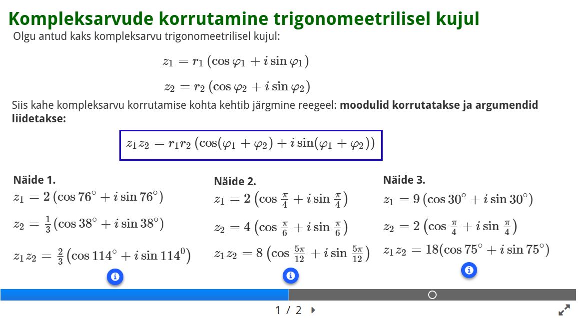 Õpiobjekt selgitab, kuidas korrutada kompleksarve, kasutades nende trigonomeetrilist kuju. Rõhk on moodulite korrutamisel ja argumentide liitmisel, mida illustreeritakse samm-sammult näidete abil.