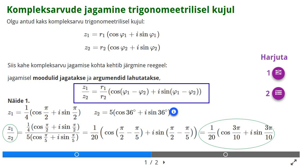 Õpiobjekt tutvustab kompleksarvude jagamise reegleid trigonomeetrilises kujus. Selgitatakse, kuidas jagada mooduleid ja lahutada argumente, et saada uus kompleksarv.