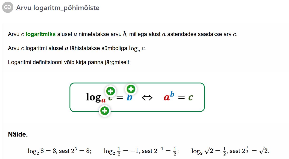Õpiobjekt keskendub logaritmiliste avaldiste arvutamisel. See arendab oskust kirjutada logaritmilist avaldist ümber astmeks.